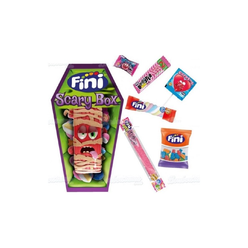 ATAUD HALLOWEEN FINI, ataud relleno de golosinas variadas de marca fini .