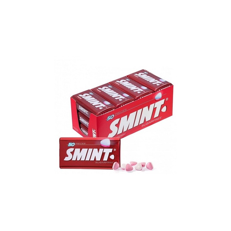 Caramelos en lata de Smint sabor fresa con 12 latas por estuche.