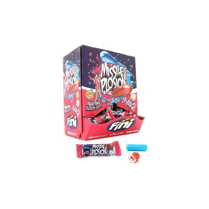 CHICLES MISSILE XPLOSION FINI, caja de 200 chicles de misil y rellenos de liquido a sabor de fresa ácida, envueltos individualmente, muy deliciosos, sin gluten