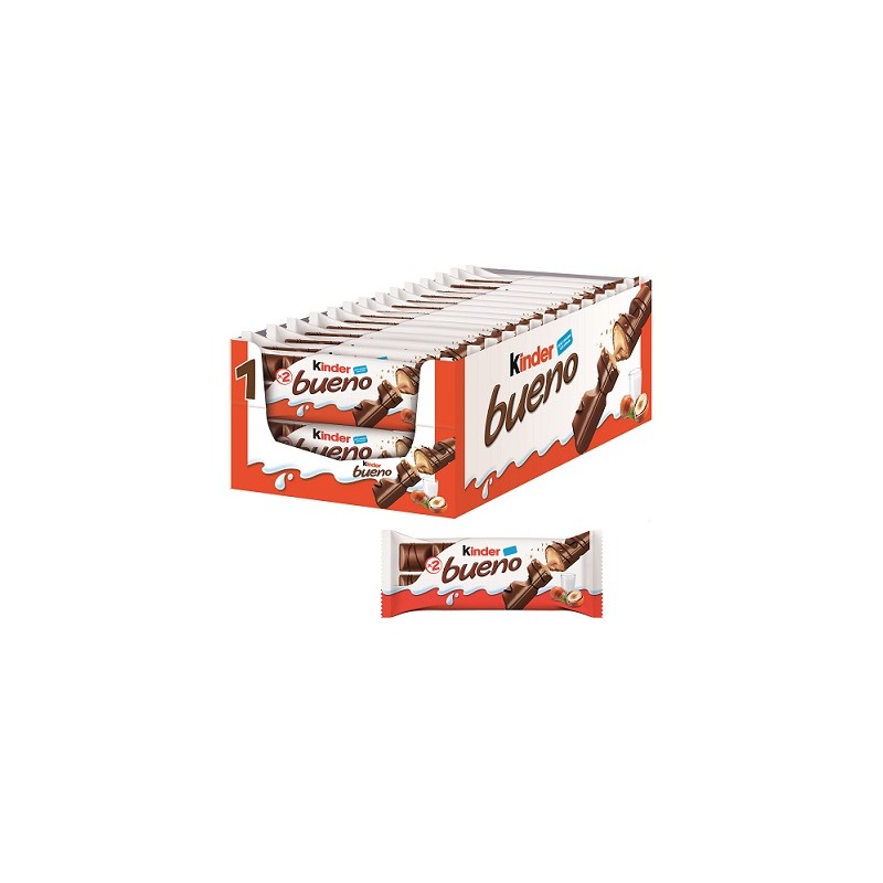 KINDER BUENO, cada una lleva dos barritas crujientes rellenas con crema de leche y avellana y con una cobertura de chocolate negro