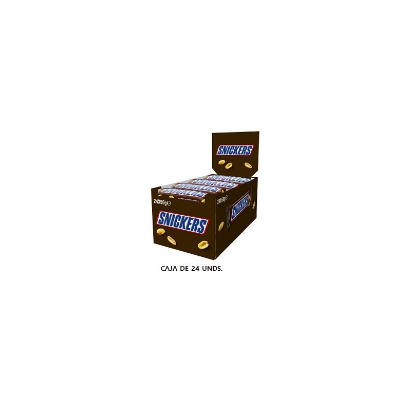 Barritas de chocolate Snickers con 80 grs cada una. La caja contiene 24 uds