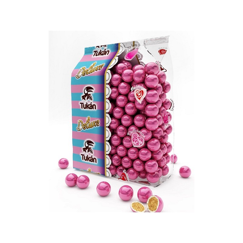 Bolas rosas crujientes rellenas de chocolate y cereales color rosa son de Tukan