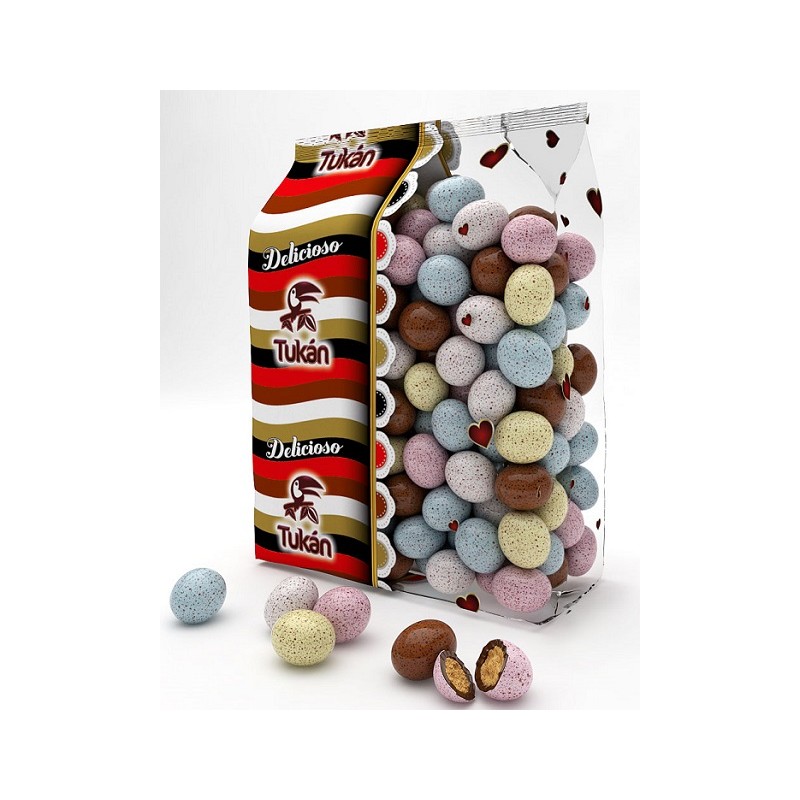 Bolas de arroz y trigo recubiertas con chocolate leche y una capa de azúcar coloreada y moteada.