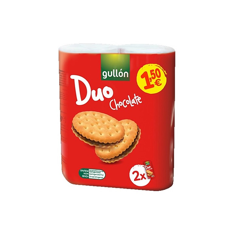 Delicioso sándwich de galletas relleno de la mejor crema de chocolate con leche. Las galletas Gullón Duo Chocolate son la clásica galleta rellena por el medio con chocolate, pero con el toque maestro de la famosa marca centenaria de galletas española