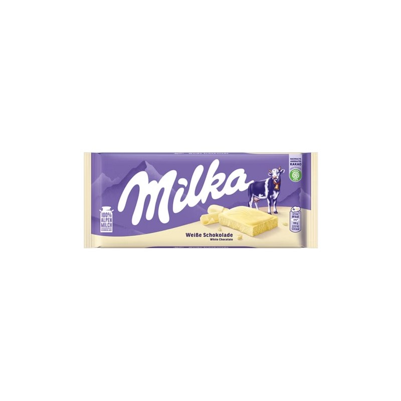 Tableta de chocolate Exquisito Blanco Milka de 100 grs. presentada en cajas de 22 unidades.