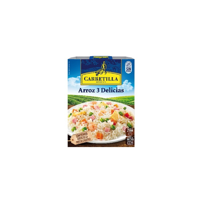 ARROZ 3 DELICIAS, una receta oriental con ingredientes mediterráneos como el arroz, gambas, zanahoria, jamón cocido, guisantes, y tortilla francesa