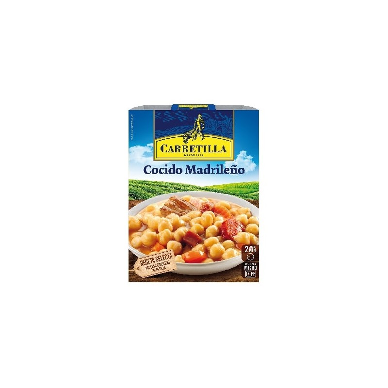 COCIDO MADRILEÑO CARRETILLA, un auténtico plato tradicional, una mezcla de garbanzos cocidos, chorizo, carne de ternera, panceta y jamón.. Receta Selecta de Carretilla.
