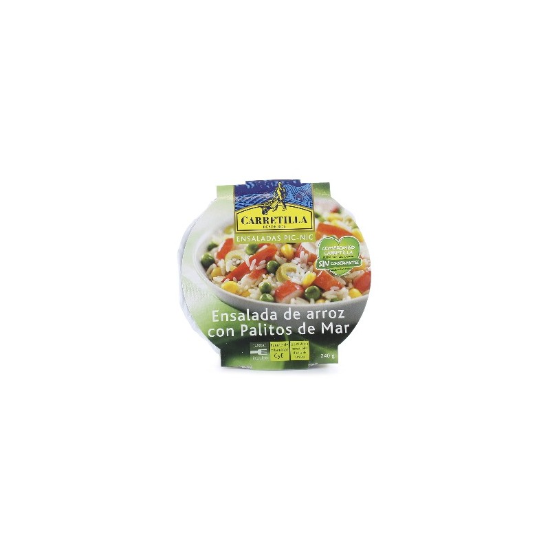 ENSALADA DE ARROZ CON PALITOS DE MAR CARRETILLA, ensaada fresca con palitos de mar, maiz, pimiento rojo y aceitunas verdes con un poco de vinagre y aciete,