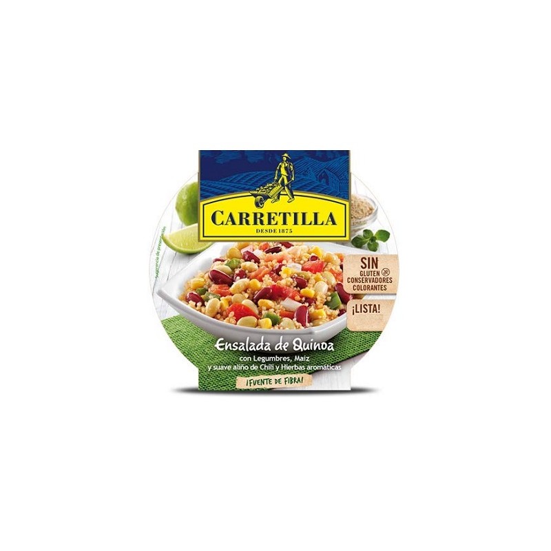 ENSALADA DE QUINOA CARRETILLA, ensalada quinoa con legumbres, maiz, suave aliño de chili, y hierbas aromaticas.