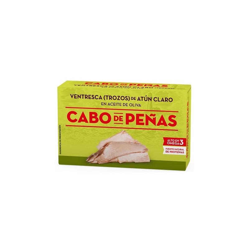 Lata de Ventresca de Atun en aceite de Oliva con un peso de 72 gr. en escurrido. Alta en omega 3. Fuente Natural de proteinas.