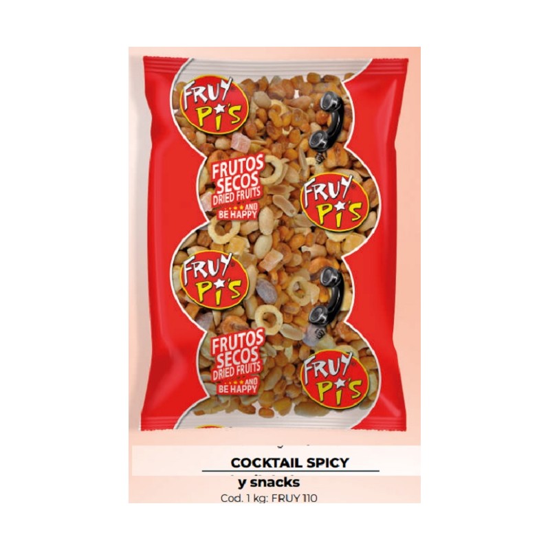 Revuelto de frutos secos compuesto de maiz gigante, cacahuete frito, maiz, anacardos y aros de maiz, todo con un toque picante exquisito.