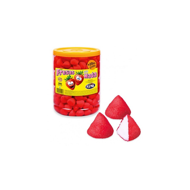 TARRO DE FRESAS CON NATA DE FINI, tarro de 200 piezas de en froma de fresa rellenas de nata a sabor de fresa nata, muy deliciosas. Producto ideal para tus pinchos de golosinas