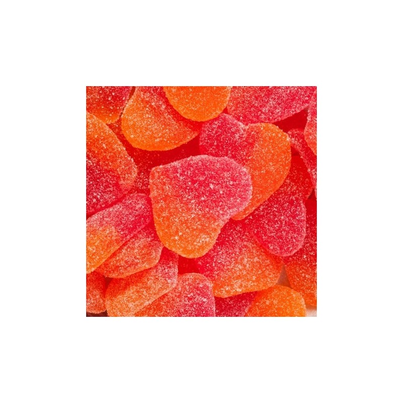 Bolsa de 250 gominolas en forma de corazones a sabor de melocoton, cubiertos de azucar, muy tiernos, ideales para dar un toque a tu mesa dulce, sin gluten