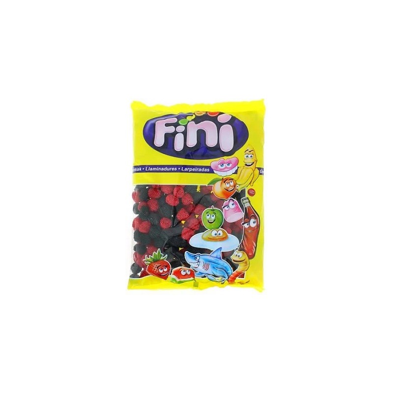 MORAS PEQUEÑAS FINI, bolsa de 1kg de moras pequeñas de gominola, en color rojo y negro, muy tiernas y deliciosas, ideales para dar un toque a tu mesa dulce o para deleitar en la sobremesa de una comida familiar o de amigos en casa.