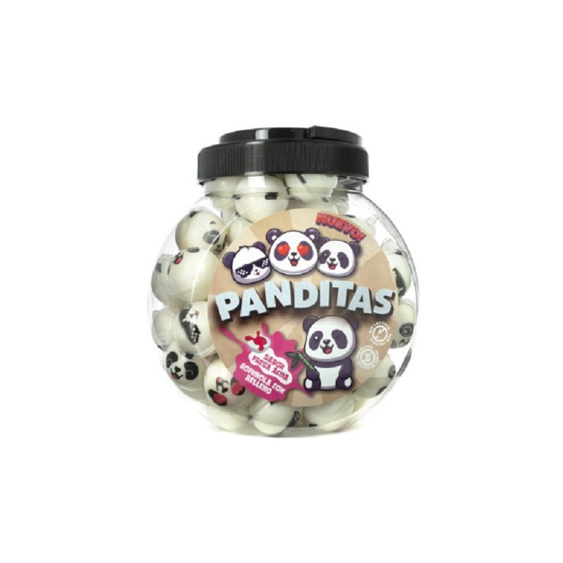 TARRO de 60 unidades de GOMINOLA RELLENA en forma de divertidas caras de OSO PANDA con sabor a fresas acidas.