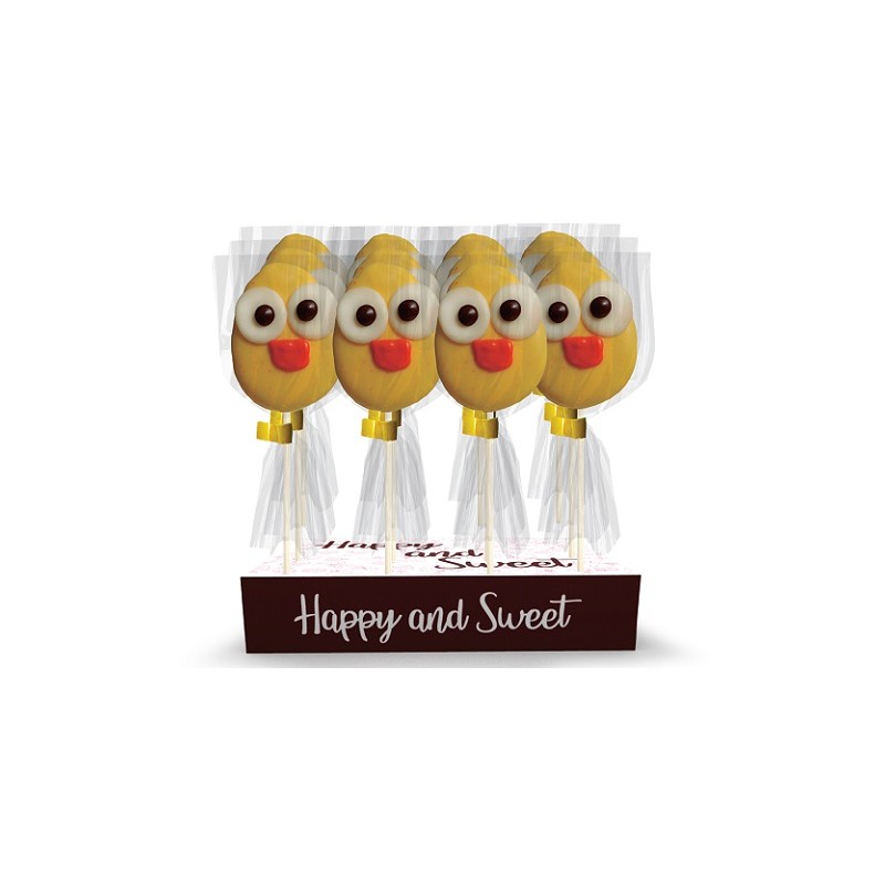 Nubes con palo, recubiertas con chocolate y con formas de pollitos . Idea para el Candy Bar de las comuniones o eventos con Niños .