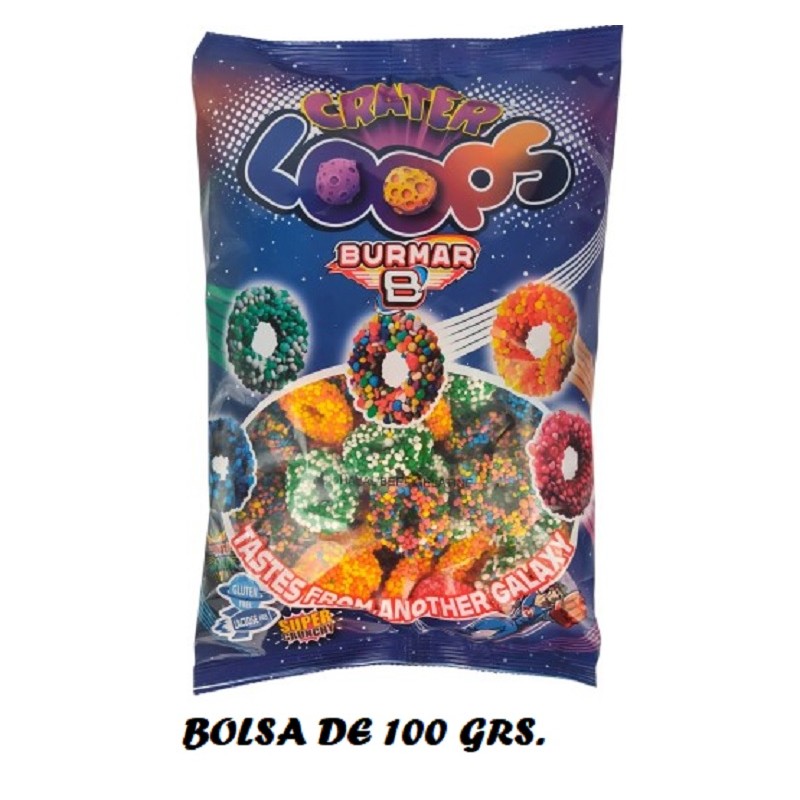 Bolsita de 100 grs. Aros Acidos SURTIDOS CRATER LOOPS burmar, caja de 14 uds.