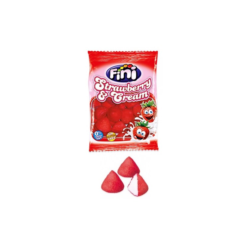 FRESA NATA FINI, caja de 12 bolsitas de 75 gramos de gominolas cremosas de sabor fresa nata fini, en forma de fresas rellenas de nata