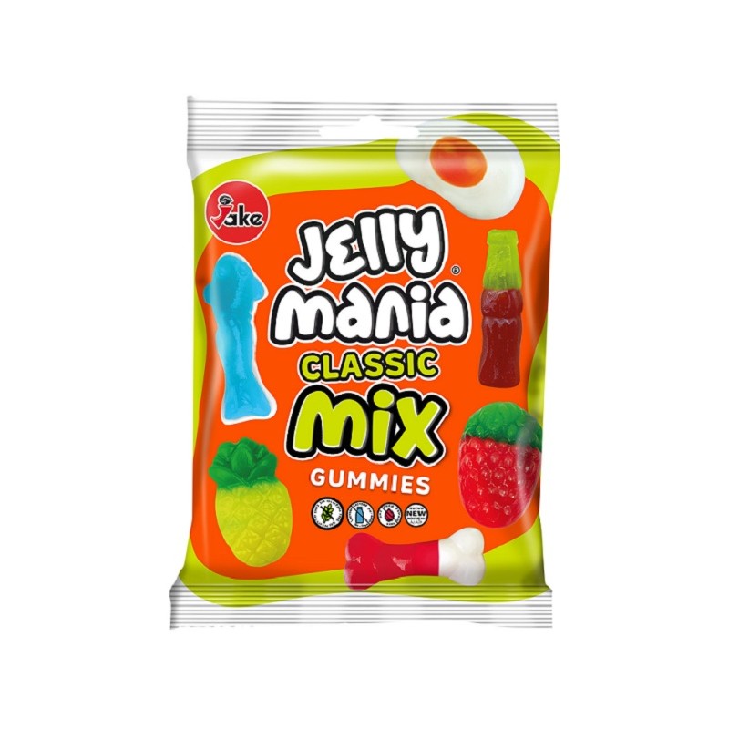Bolsitas de gominolas de Jellymania de JAKE con SURTIDO DE GOMAS. El precio es por unidades y se vende en cajas de 18 uds de 100 grs cada bolsita.
