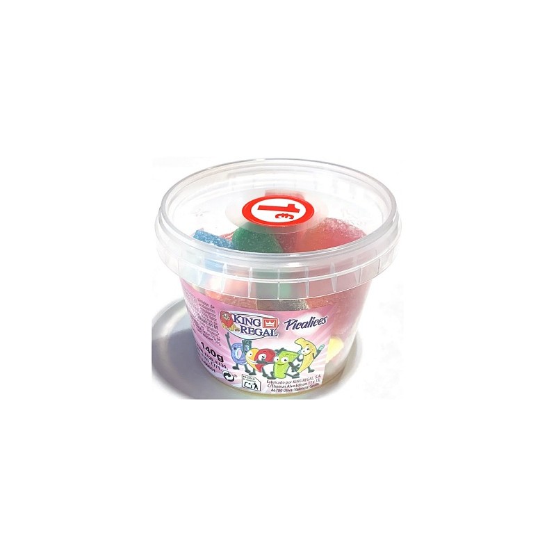 TARRINA PICALICES KING REGAL, surtido de gominolas muy deliciosas en diferentes colores y en varios sabores con una cobertura de azucar, ideal para mesas dulces