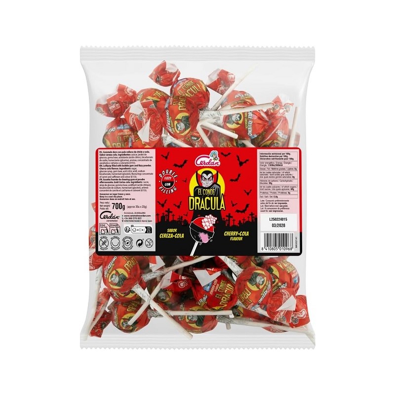 Chupas con Palo de Caramelos Cerdan, motivo CONDE DRACULA, sabor a cola y cereza la presentacion es en bolsa de 35 uds. de 20 grs. cada unidad.