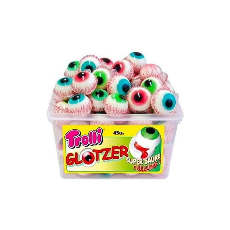 OJO DE GOMINOLA DE GELATINA ENVUENTA INDIVIDUAL, forma autentica de ojo, tarro de 45 uds, de varios colores y sabores. Ideal para fiestas y eventos como HALLOWEEN.
