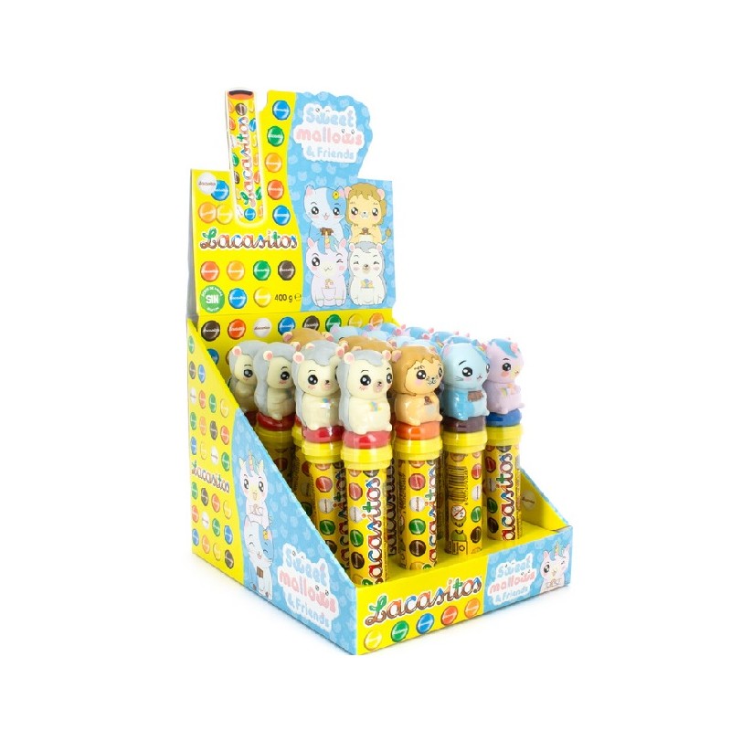 TUBOS de lacasitos con figura de MALLOW&FRIENDS, Caja de 20 uds de 20 gramos cada uno.