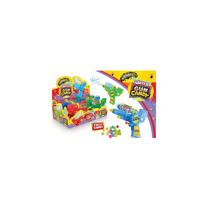 Revólver de agua en plástico con gran carga. En el interior lleva esferitas de golosina de colores con sabor a frutas. Caja con 12 revolveres.