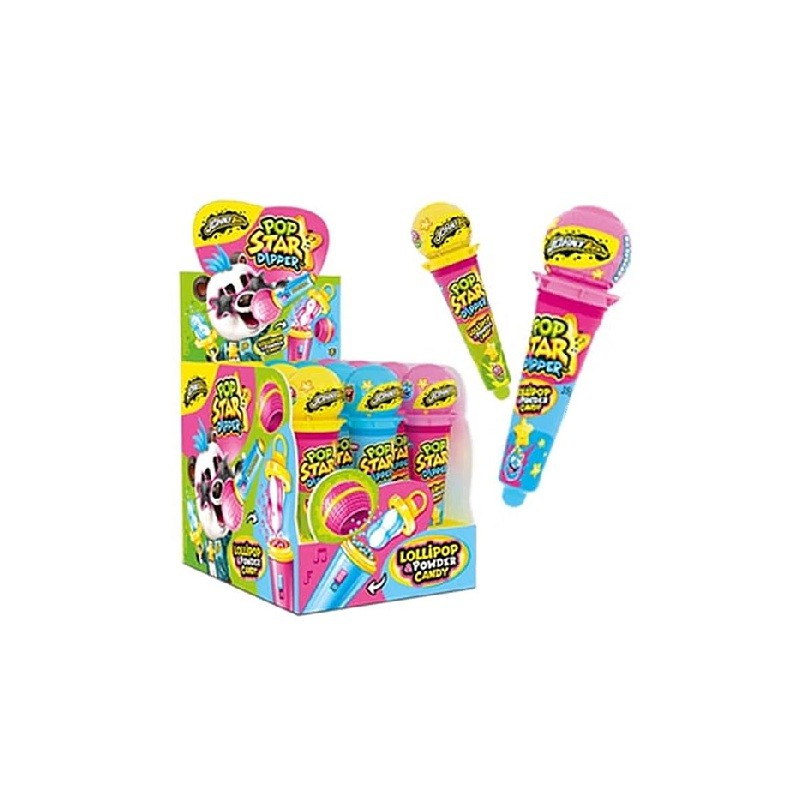 Pop Star Dipper es un caramelo con forma de microfono y con polvos ácidos para mojar