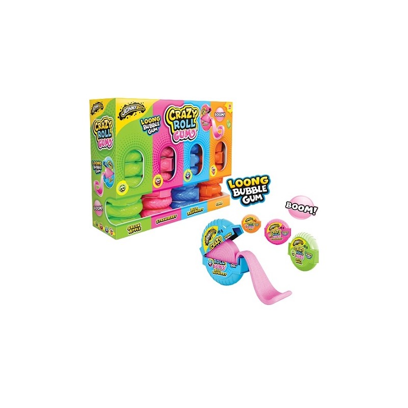 Expositor de 36 uds con 4 Sabores diferentes; (manzana verde, fresa, arándano azul y sandia) de chicle con azucar presentado en un rollo con espendedor cada una pesa 18 gramos.