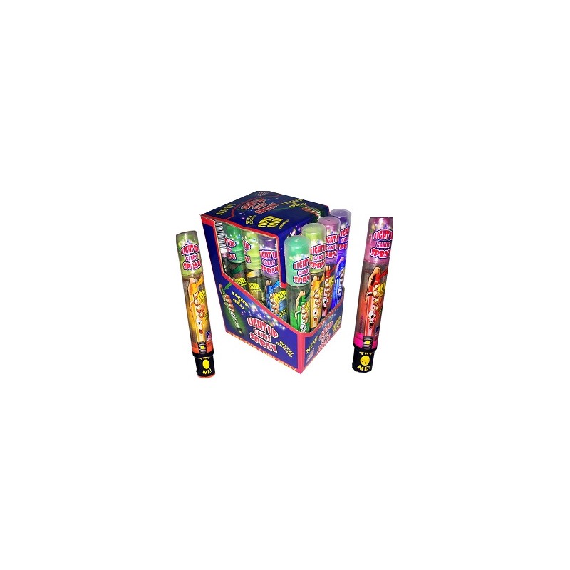 SPRAY CON LUZ, estuche con 18 unidades de spray de caramelos liquido con luz en el interior, ideal para los peques