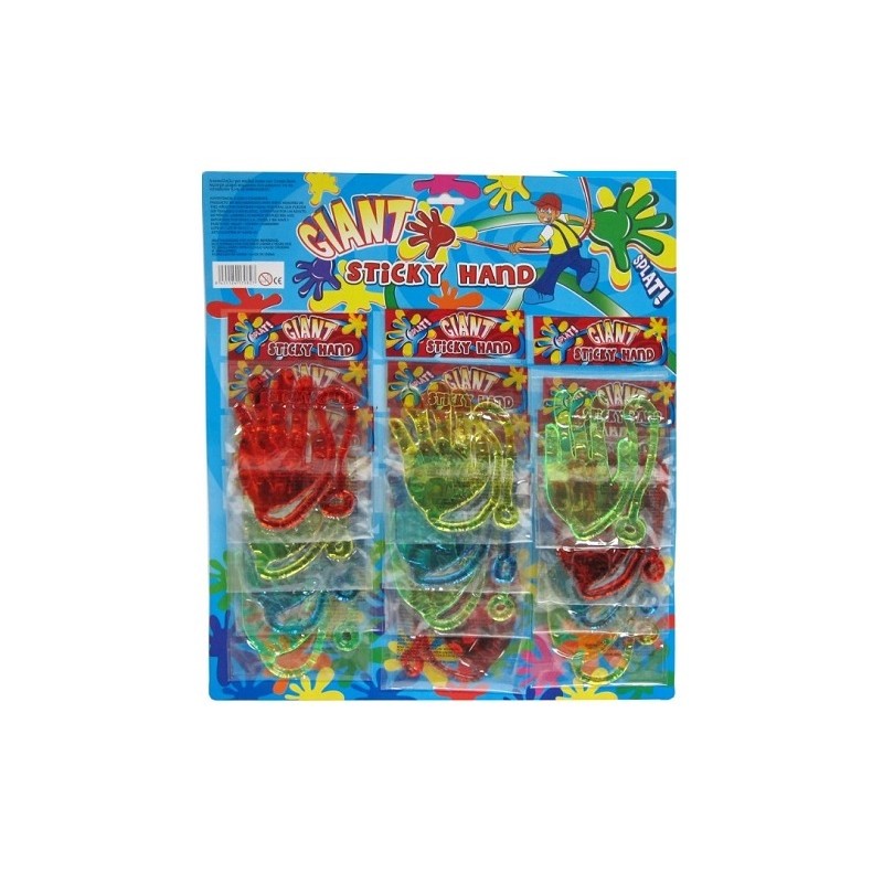 MANOS PEGAJOSAS Gigantes y divertidas en varios colores, presentacion en panoplias de 12 uds.