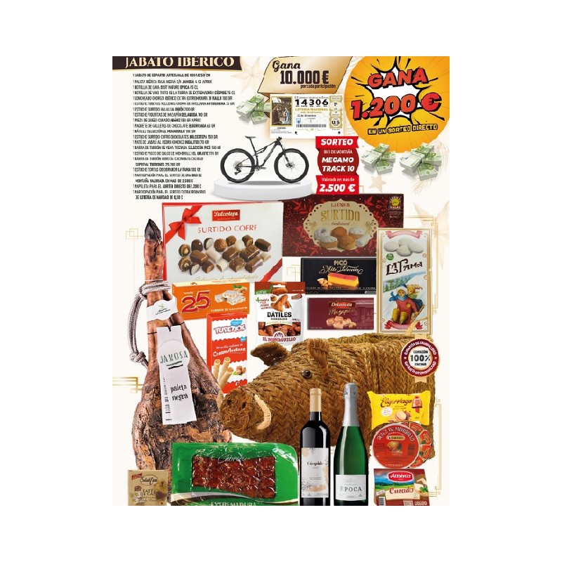 1 PALETA IBÉRICA RAZA NEGRA S/N JAMOSA 4 KG APROX1 BOTELLA DE CAVA BRUT NATURE ÉPOCA 75 CL1 BOTELLA DE VINO TINTO DE LA TIERRA DE EXTREMADURA CÚSPIDE 75 CL1 LONCHEADO CHORIZO IBÉRICO EXTRA EXTREMADURA DI FIALLO 100 GR1 ESTUCHE TUBETOS RELLENOS CREMA DE AVELLANA ANTIUXIXONA 75 GR1 ESTUCHE SURTIDO HALAL LA UNIÓN 200 GR1 ESTUCHE FIGURITAS DE MAZAPÁN DELAVIUDA 100 GR1 PIEZA DE QUESO CURADO ABéNIZ 150 GR APROX1 PAQUETE DE GALLETAS DE CHOCOLATE ELGORRIAGA 60 GR1 DÁTILES SELECCIÓN EL MONAGUILLO 100 GR1 ESTUCHE SURTIDO COFRE CHOCOLATES DULCESTEPA 150 GR1 PATÉ DE JABALÍ AL PEDRO XIMENEZ INDALITOS 70 GR1 BARRA DE TURRÓN DE YEMA TOSTADA SELECCIÓN PICÓ 150 GR1 ESTUCHE PICOS DE DULCE DE MEMBRILLO EL QUIJOTE 170 GR1 BARRA DE TURRÓN DURO DE CACAHUETE CALIDAD SUPREMA TURRONES 25 200 GR1 ESTUCHE TORTAS DE OBRADOR LA FAMA 100 GR1 PARTICIPACIÓN PARA EL SORTEO DE UNA BICI DE MONTAÑA VALORADA EN MAS DE 2.500 1 PAPELETA PARA EL SORTEO DIRECTO DE 1.200 1 PARTICIPACIÓN PARA EL SORTEO EXTRAORDINARIO DE LOTERÍA DE NAVIDAD