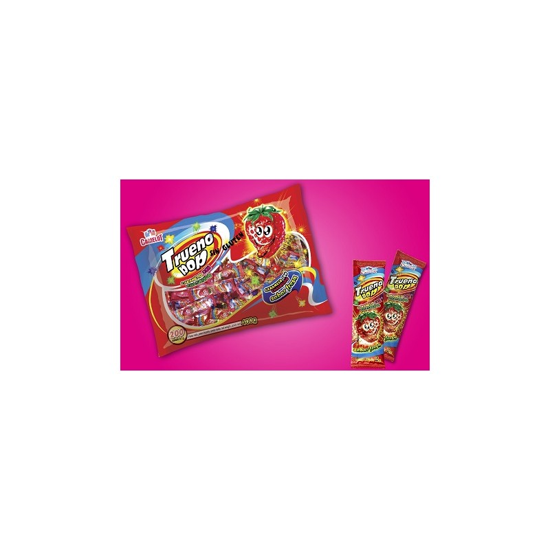TRUENO POP, bolsa de 200 caramelos con chasquido a sabor fresa con pica pica, envueltos individualmente